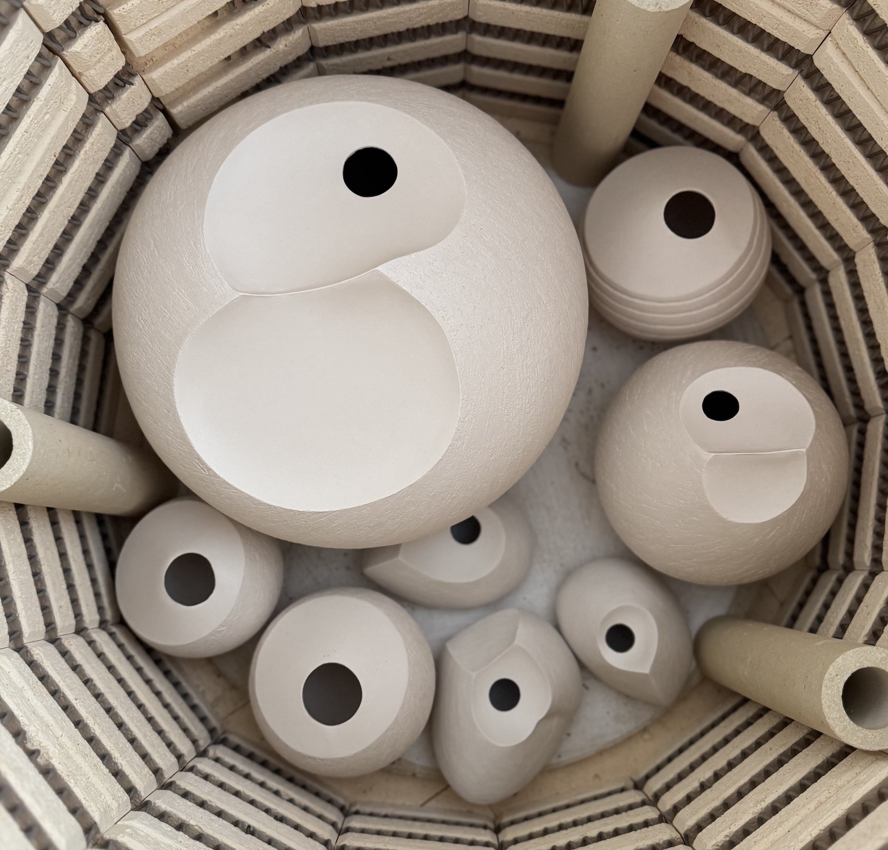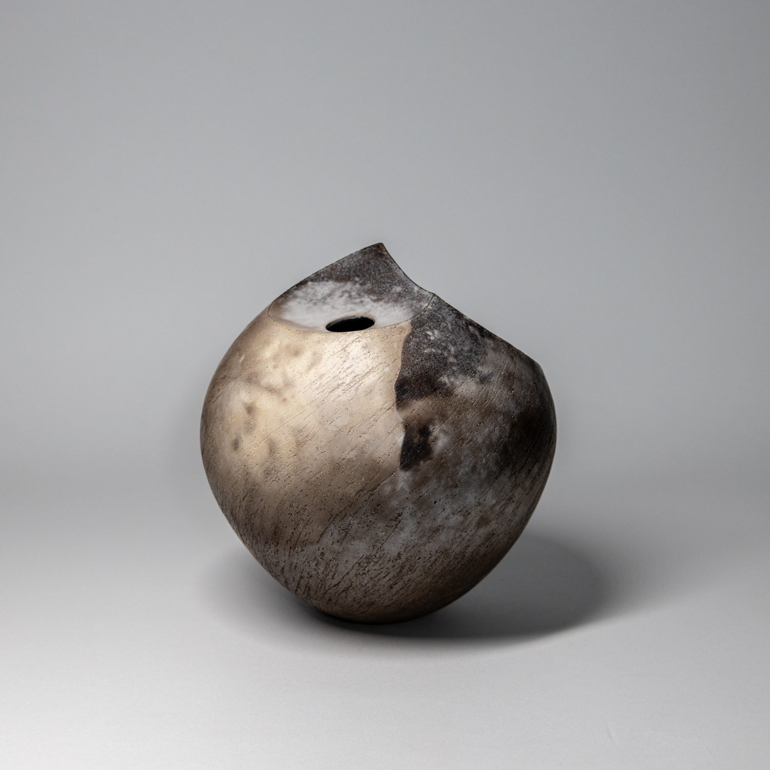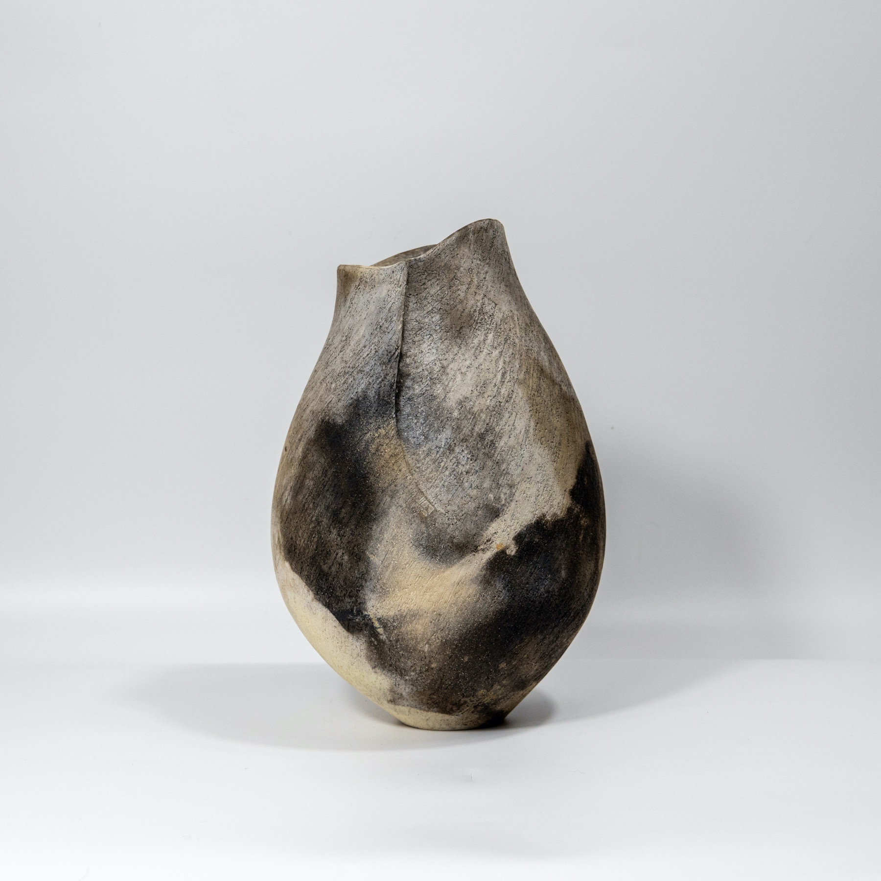 I make sculptural ceramic vessels and forms using clay hand building techniques; pinching, coil-building, slab-building, imprinting. At times I will have sketched my ideas in advance but more commonly new work evolves as I build, creative choices being made intuitively. A build is complete when it is refined in form and texture. The decorative finish of the work is achieved by smoke-firing, the transformative alchemy of fire and smoke on the unglazed ceramic surface.