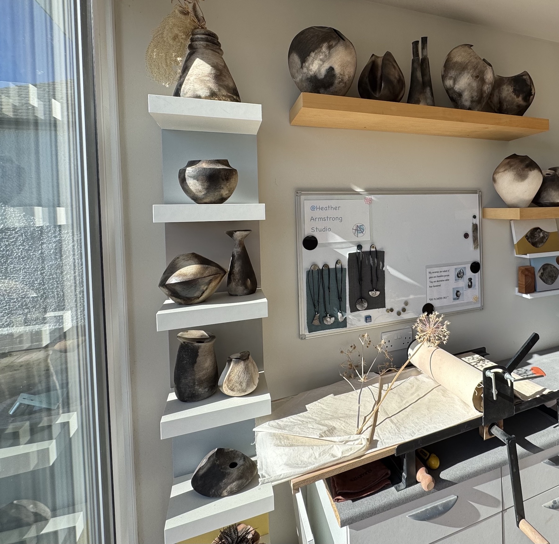 I have a small studio space (half a garage) at my home where I enjoy the convenience of dipping in and out as my process requires.