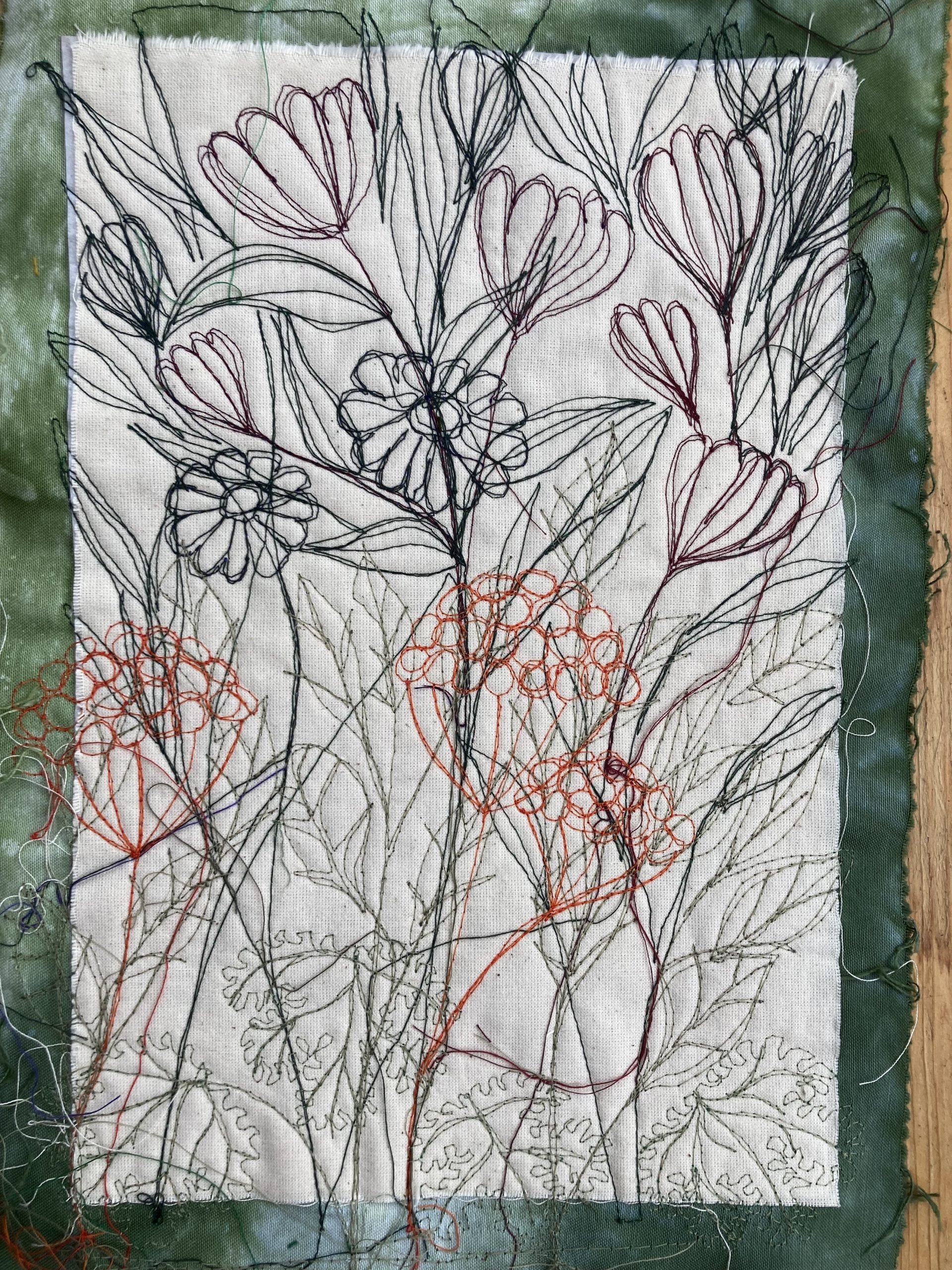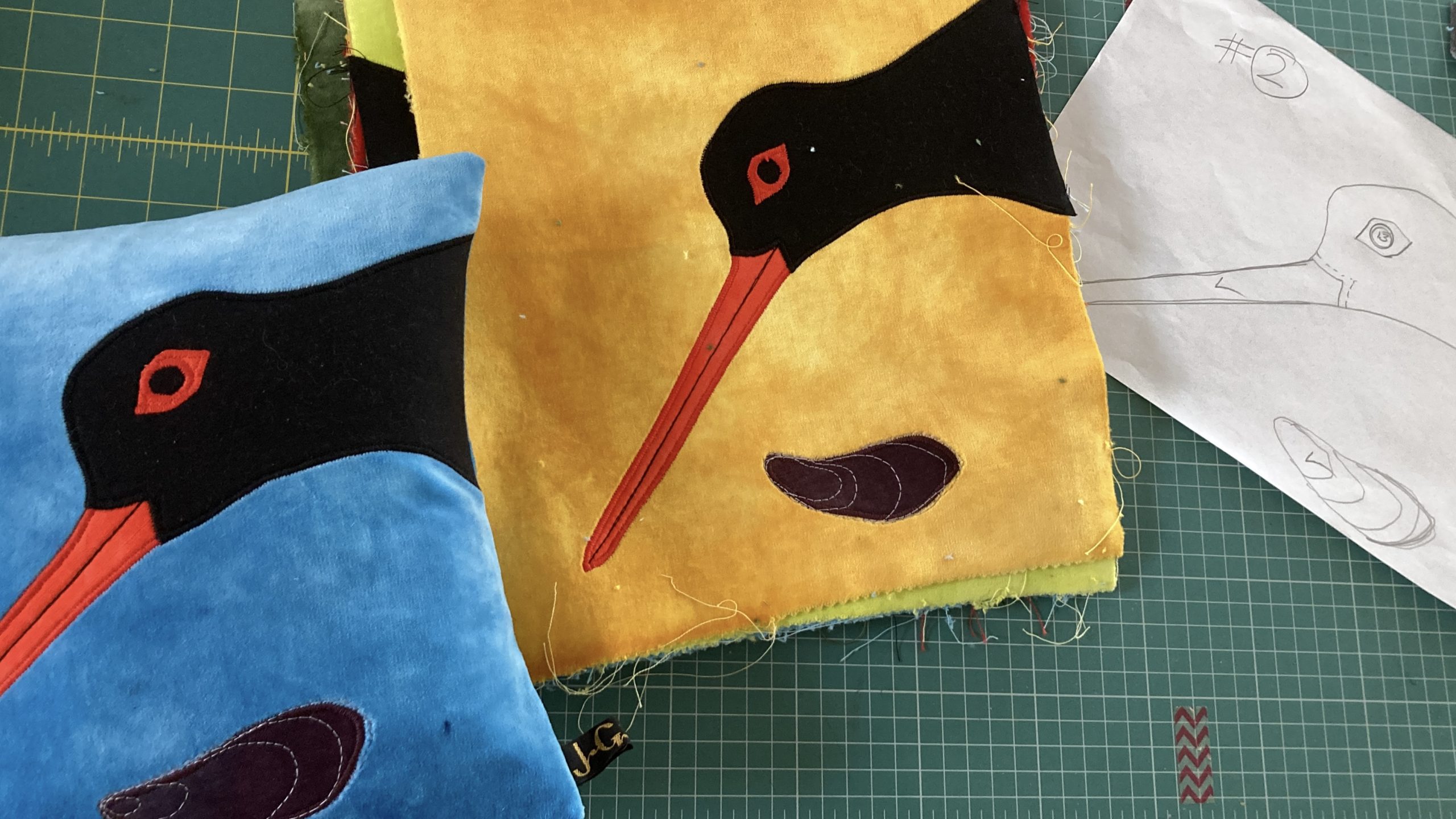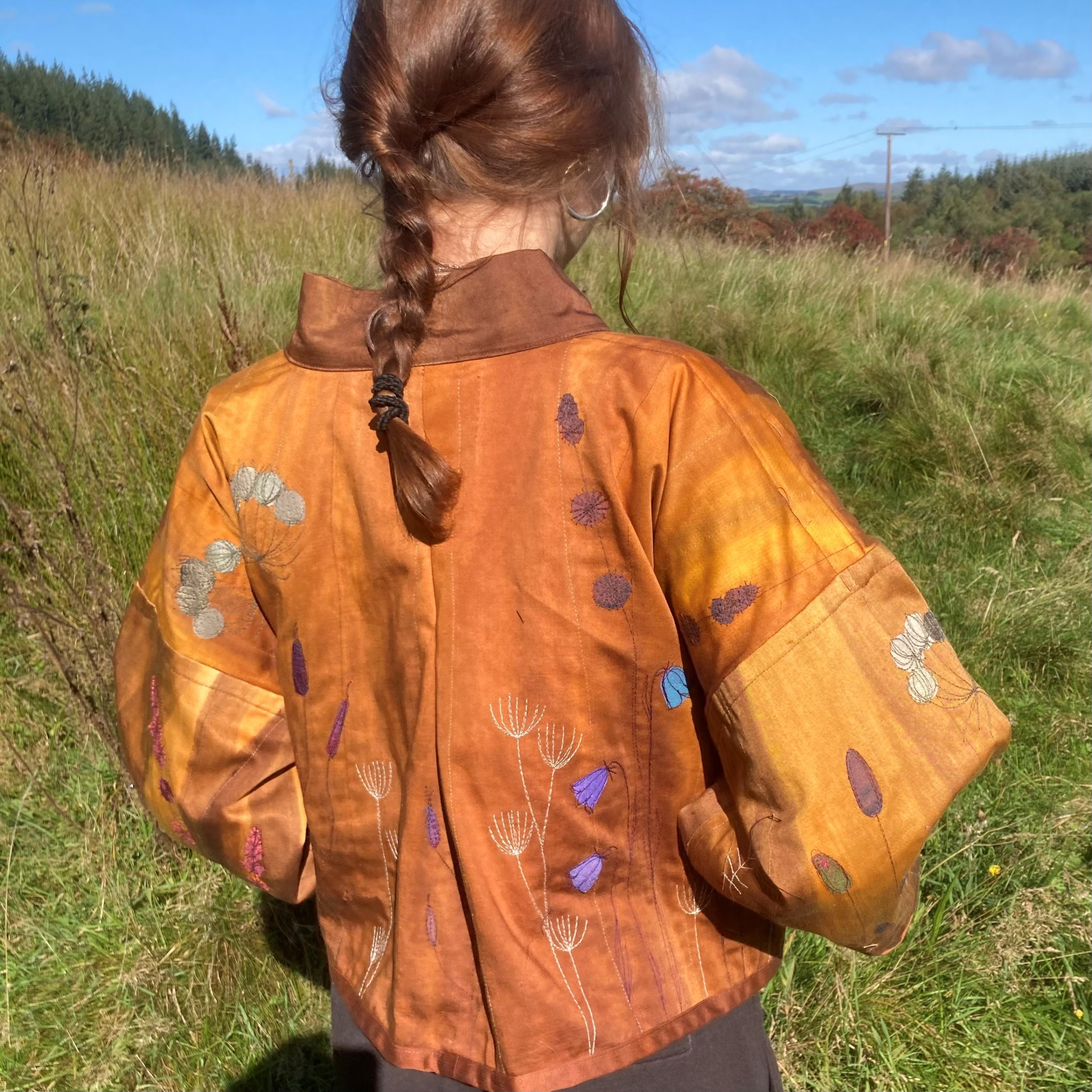 I make cushions and one-off decorative wall panels on themes from wide skies and hills to quirky birds and animals, and the detail of meadow flowers and grasses. I have recently started experimenting with transferring these designs to simple jackets.