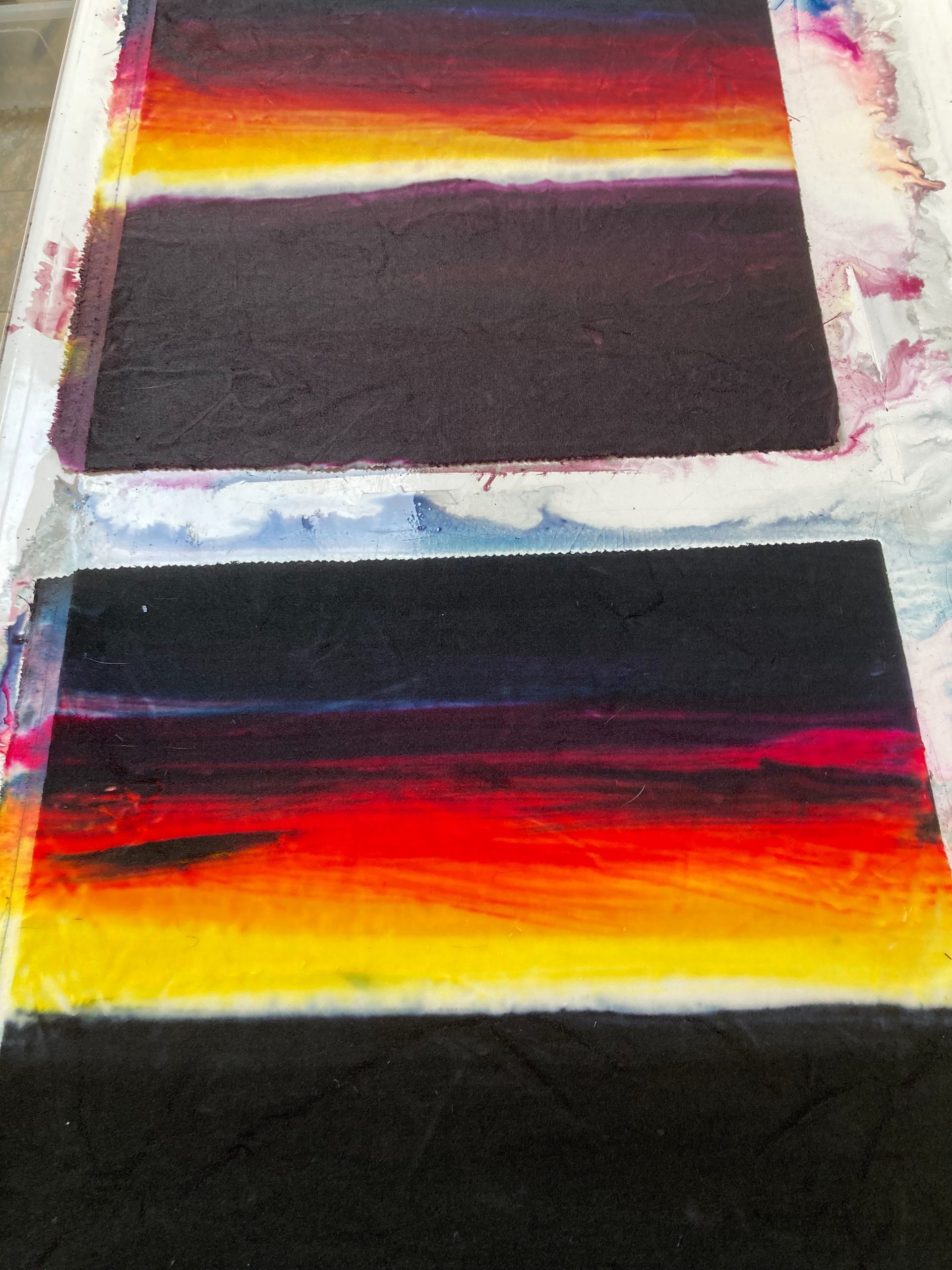 My materials are mostly linen and cotton in a variety of weights and textures, fibre-reactive dyes, and thread. My main tools are my iron, my scissors, and my sewing machines. I try to reduce waste as much as possible by careful planning and cutting of the fabric to size before dyeing it, and using fabrics which have been handed on to me.