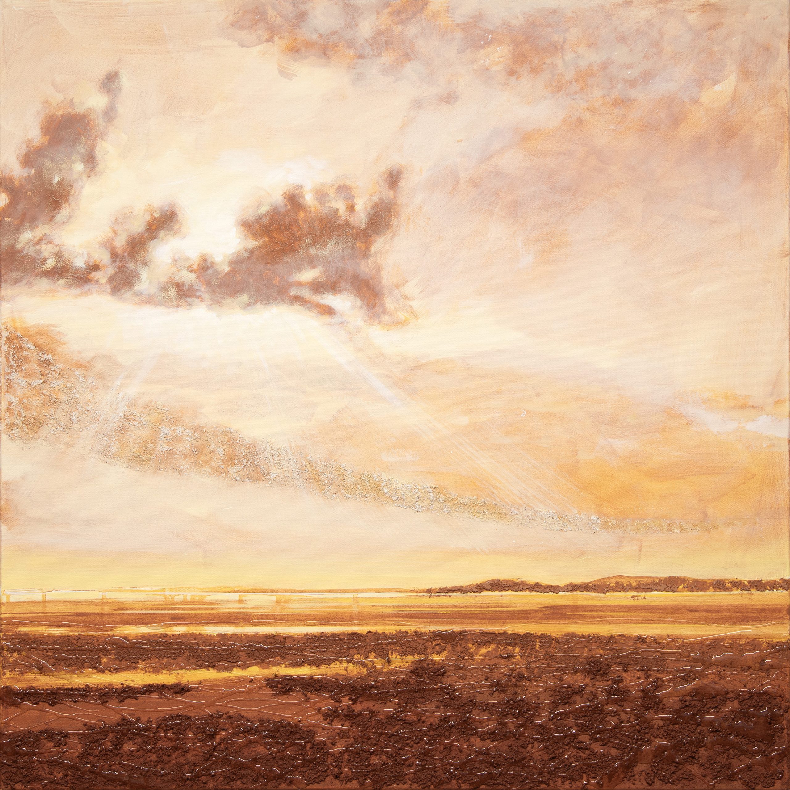 The studio is part of the steading where we live. My processes involve a collaboration of materials. These include inkjet pigment, acrylic paint, print on paper and metal leaf.